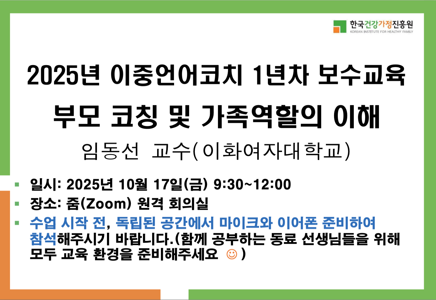 Dr. Yim conducted parent coaching on how to support language development in bilingual children at home. This session was organized by Guri Family Center and Gyeonggi province.